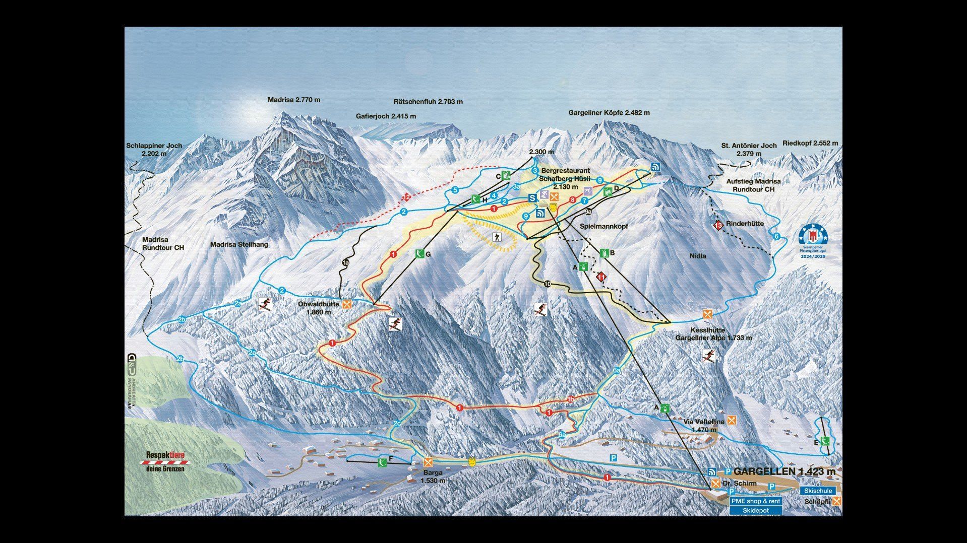 39-kilometrowa dolina Montafon w Vorarlbergu wyróżnia się przede wszystkim niewielkimi, tradycyjnymi miejscowościami oraz świadomym podejściem do bogactwa przyrodniczego i licznych atrakcji górskich. Dla ochrony przyrody i lokalnych tradycji powstało nawet stowarzyszenie „bewusstmontafon”, którego logo wyróżnia produkty pochodzące z lokalnej produkcji. Spokojne miejsca wypoczynku w dziewiczej dolinie oferują idealne warunki do relaksu z dala od turystycznych centrów. Oprócz kilku urokliwych ośrodków narciarskich, region zapewnia szeroką gamę atrakcji rekreacyjnych, takich jak wędrówki zimowe i w rakietach śnieżnych, narciarstwo biegowe, sanki czy jazda na łyżwach.Dojazd Gargellen