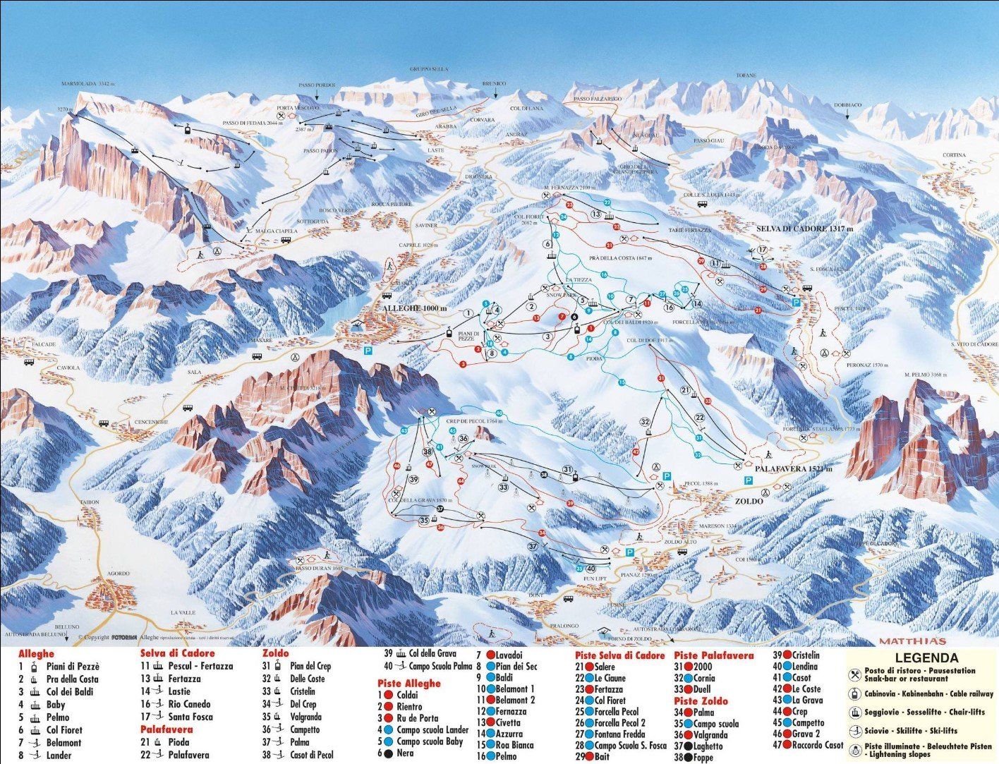 Ponad Alleghe znajdziemy nartostrady z przewagą koloru niebieskiego . Zjazd koloru czarnego "Nera" jest stromym zjazdem przeznaczonym dla zaawansowanych narciarzy. Poniżej stacji górnej Col dei Baldi-Lifts znajduje się również piękny snow park "Central Park" z elementami typu kickern i boardercross.